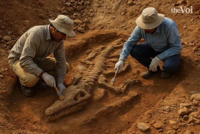The discovery came after villagers spotted skeletal remains while digging a lake. Excavations later revealed the fossil along with a fossilized egg, thought to belong to the same species.