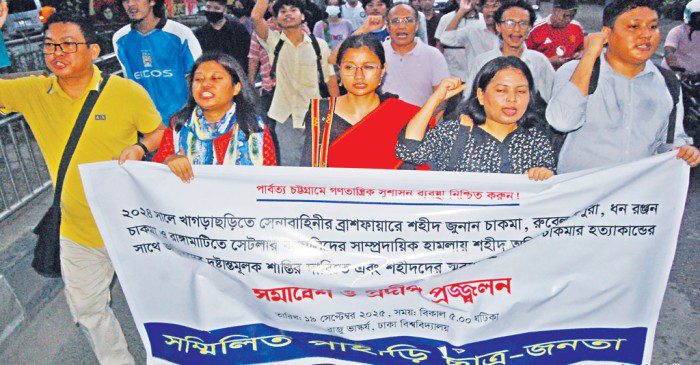 In Rangamati, fronts backed by the United People’s Democratic Front—including Pahari Chhatra Parishad, Gonotantrik Juba Forum, and Hill Women’s Federation—organized a protest in Kutukchori, echoing demands for accountability.