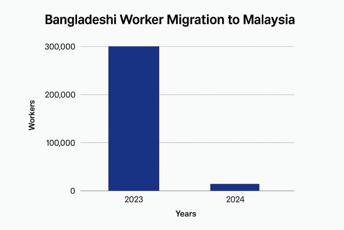 A severe decline has been recorded in the export of Bangladeshi workers to Malaysia. Recent government statistics show that while more than three lakh workers secured employment in Malaysia during the final year of the previous government, that number has now plummeted to almost zero under the current interim administration led by Yunus.