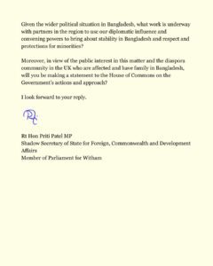 London — The UK’s Shadow Secretary of State for Foreign, Commonwealth and Development Affairs, Rt Hon Priti Patel MP, has written to the Foreign Secretary expressing deep concern over what she described as a sharp rise in religious persecution and violence against minorities in Bangladesh.