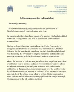 The letter further questions what concrete assurances the UK government has received from Dhaka regarding measures to protect Hindu communities from attacks, and whether the Bangladesh High Commissioner in London has been formally engaged on the issue.
