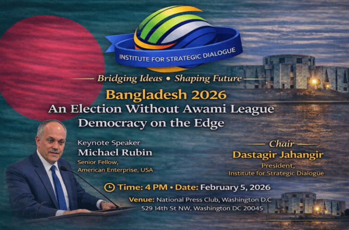 At a policy dialogue hosted by the Institute for Strategic Dialogue (ISD) at the National Press Club on February 5, 2026, American Enterprise Institute senior fellow Michael Rubin said the decision to bar the Awami League — Bangladesh’s largest and historically dominant political party — from electoral participation reflects uncertainty about defeating it in a genuinely free and competitive contest, rather than any clearlegal necessity.