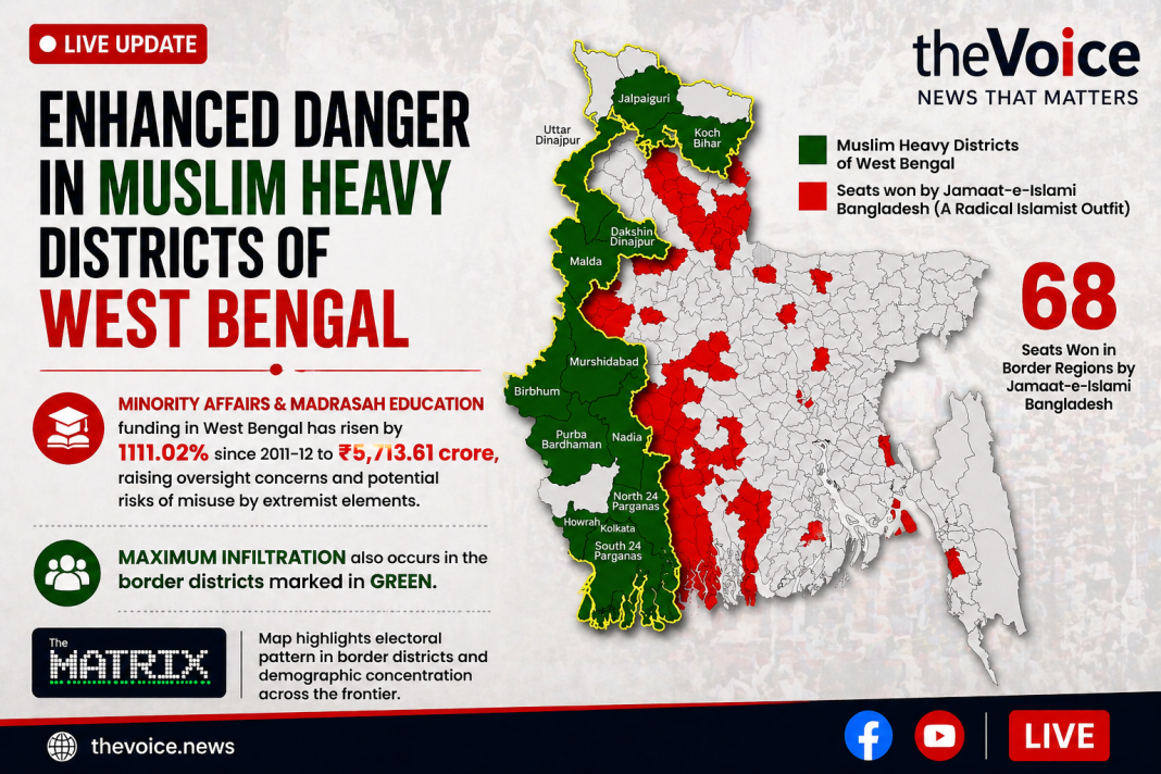 The graphic, shared by a platform identified as “The Matrix,” highlights what it describes as “enhanced danger” in Muslim-majority or Muslim-heavy districts along the India–Bangladesh border. It claims that funding for minority affairs and madrasa education in West Bengal has increased by more than 1,111 percent since 2011–12, reaching approximately ₹5,713.61 crore.